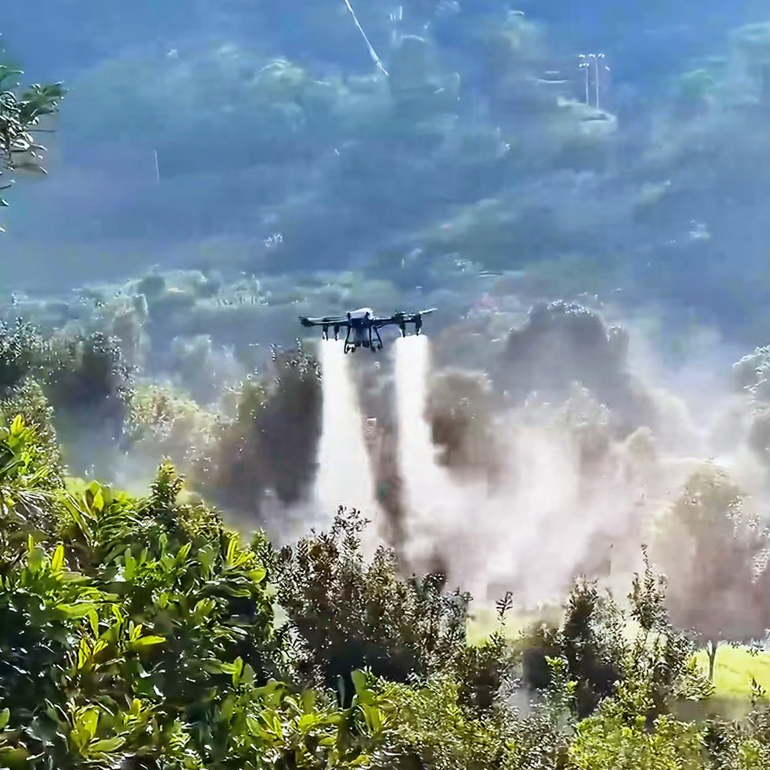 Оснащений «Імітація місцевості Автономний політ і функція розпилення туману вДрон J100забезпечили ефективний процес запилення. Його регульована функція розпилення 10-300 мікрон дозволило лікарській рідині рівномірно покрити як поверхню, так і нижню частину листя, що значно підвищило ефективність операції. За допомогою цієї передової технології знадобилося лише півдня, щоб завершити запилення майже 200 акрів горіхових дерев. Це не тільки значно скоротило робочу силу, витрати часу та ризики безпеки експлуатації, але й покращило загальний ефект запилення.
